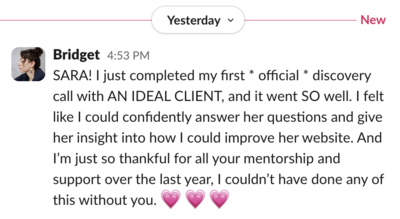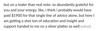 "Like I actually had a good handle on project management, onboarding, etc. but had no idea where I wanted to take my business. Now, I’m vibin' (and low key, I’m a little richer) — I feel like I actually know what I want my business to do and what *I* want to do, and I have more of the confidence I need to just… fucking do it???"