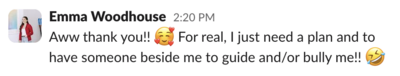 I’m an extremely validating mentor, but that doesn’t mean I won’t call you on your shit or challenge you to improve. I’m your typical New England Nice (aka I’ll lovingly bully you into being your best self).