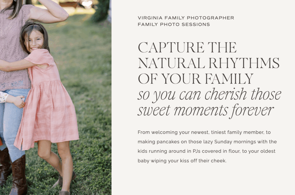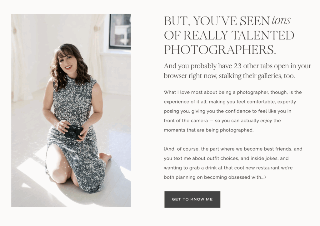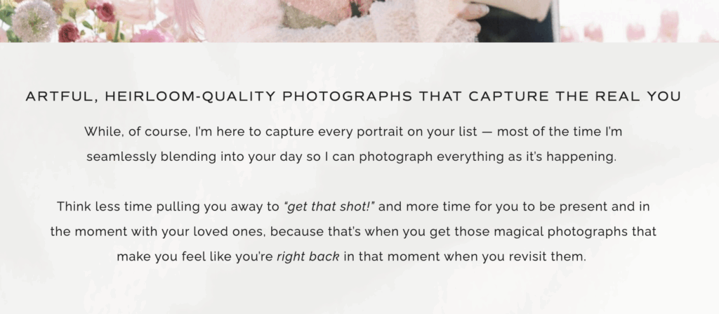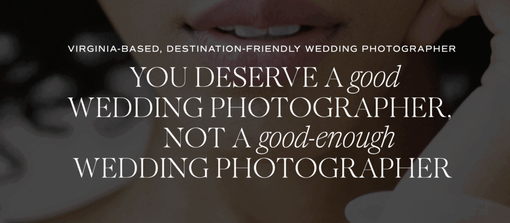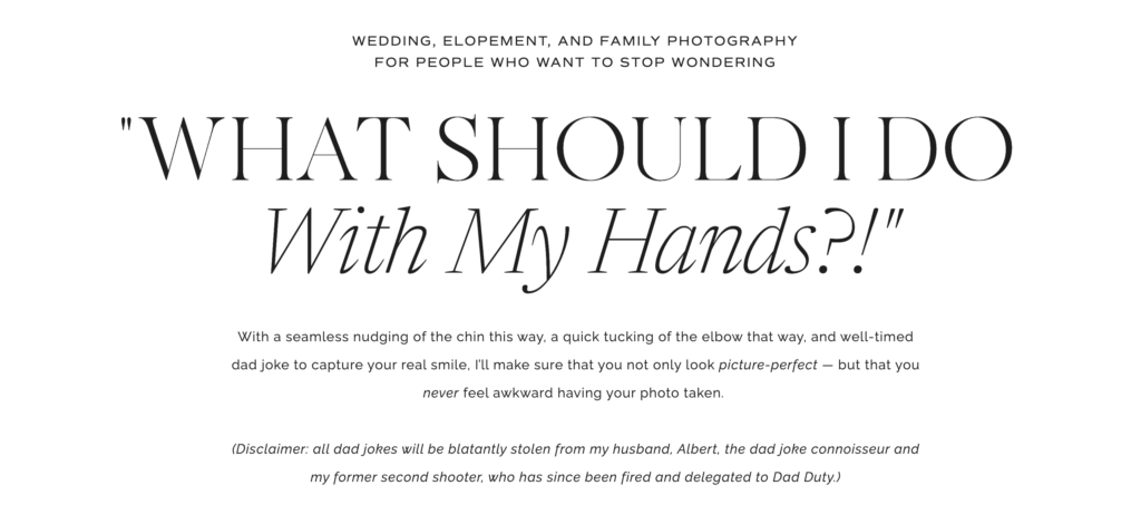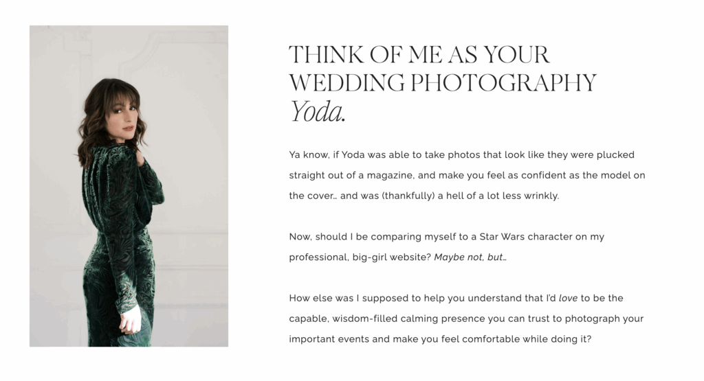 & THANK GOD SHE DID – because her website is one of my most favorite photographer websites I’ve written in all my time as a website copywriter! It’s also become a go-to example for me (for tons of reasons!) while I’m teaching website copy, too.