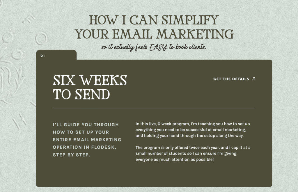 We also focused on proving her expertise, selling her offers in a more convincing way, and simplifying the parts of email marketing she knows her ideal clients find difficult.