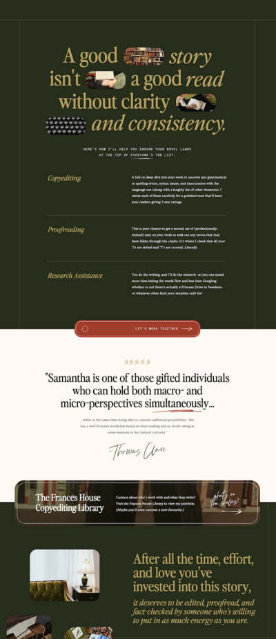 "I had the pleasure of working with both Sara(h)s for my website and they are the ultimate dream team. Communication, expertise, knowledge and experience were all 10/10. They were able to help me decide what I wanted and articulate that for me in words and design that I could have never done for myself. Highly recommend!"