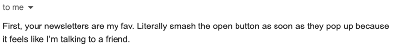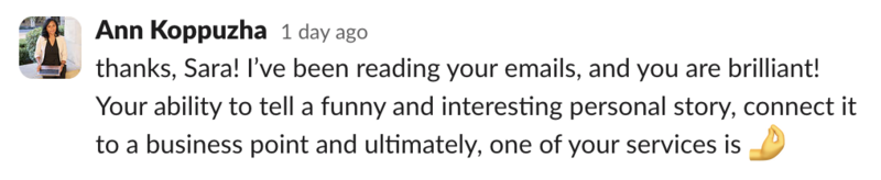 "I always feel like Sara's writing directly to me. They're always so funny; I love opening them and just having a chuckle. She writes very human-like, and she's a pro at conversational copywriting—she really writes in a relatable tone that makes you want to open & read every week. You're always left with such value—she shares so many resources."